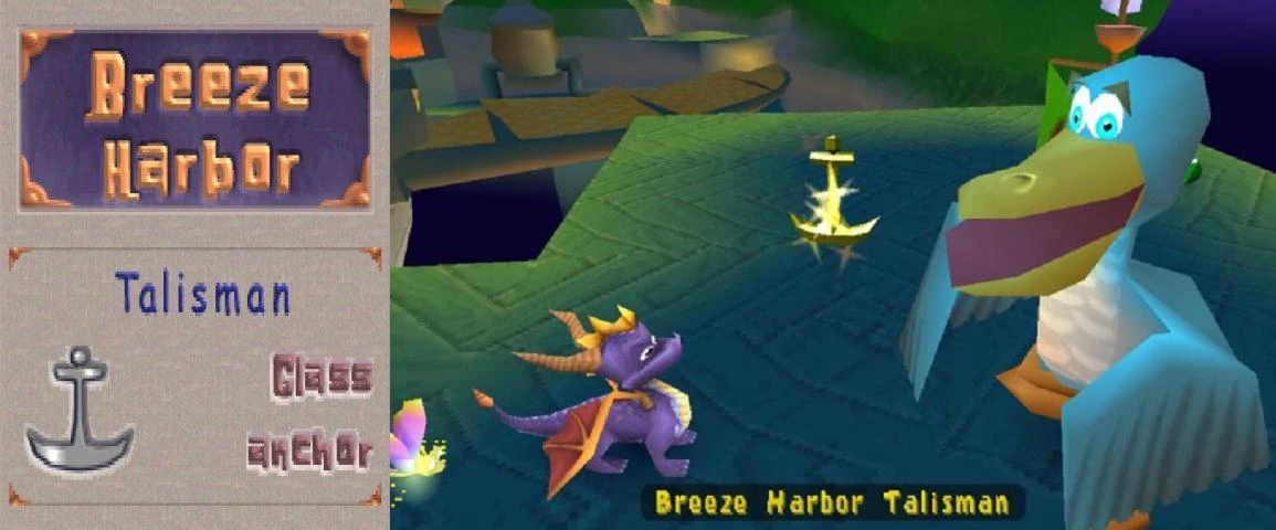 Бризодел Сквок вручает Спайро талисман уровня — Glass Anchor (Стеклянный якорь). На страничке Бризовой Гавани в гиде он выглядит серебристым, а при передаче Спайро — золотым.