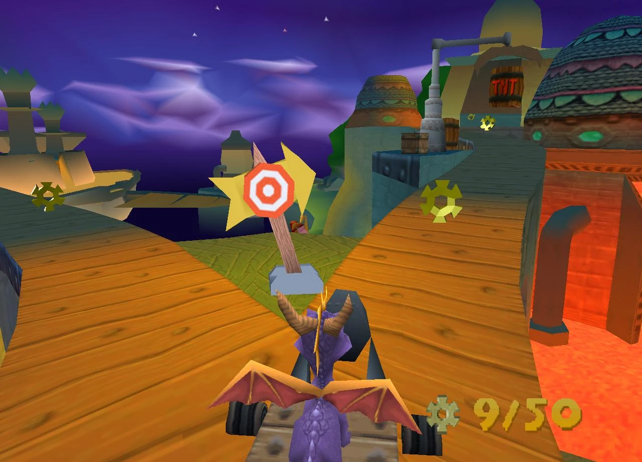 - У бризодела Фишера случилась беда, у него сломалась машина. Он просит Спайро проехать на вагонетке и собрать 50 потерянных деталей. Это задание оценено разработчиками на 5 звёзд (очень сложное). На вагонетке установлена пушка, которая нужна для того, чтобы переключать стрелки на путях и уничтожать бочки с динамитом. На трассе встречаются несколько препятствий: