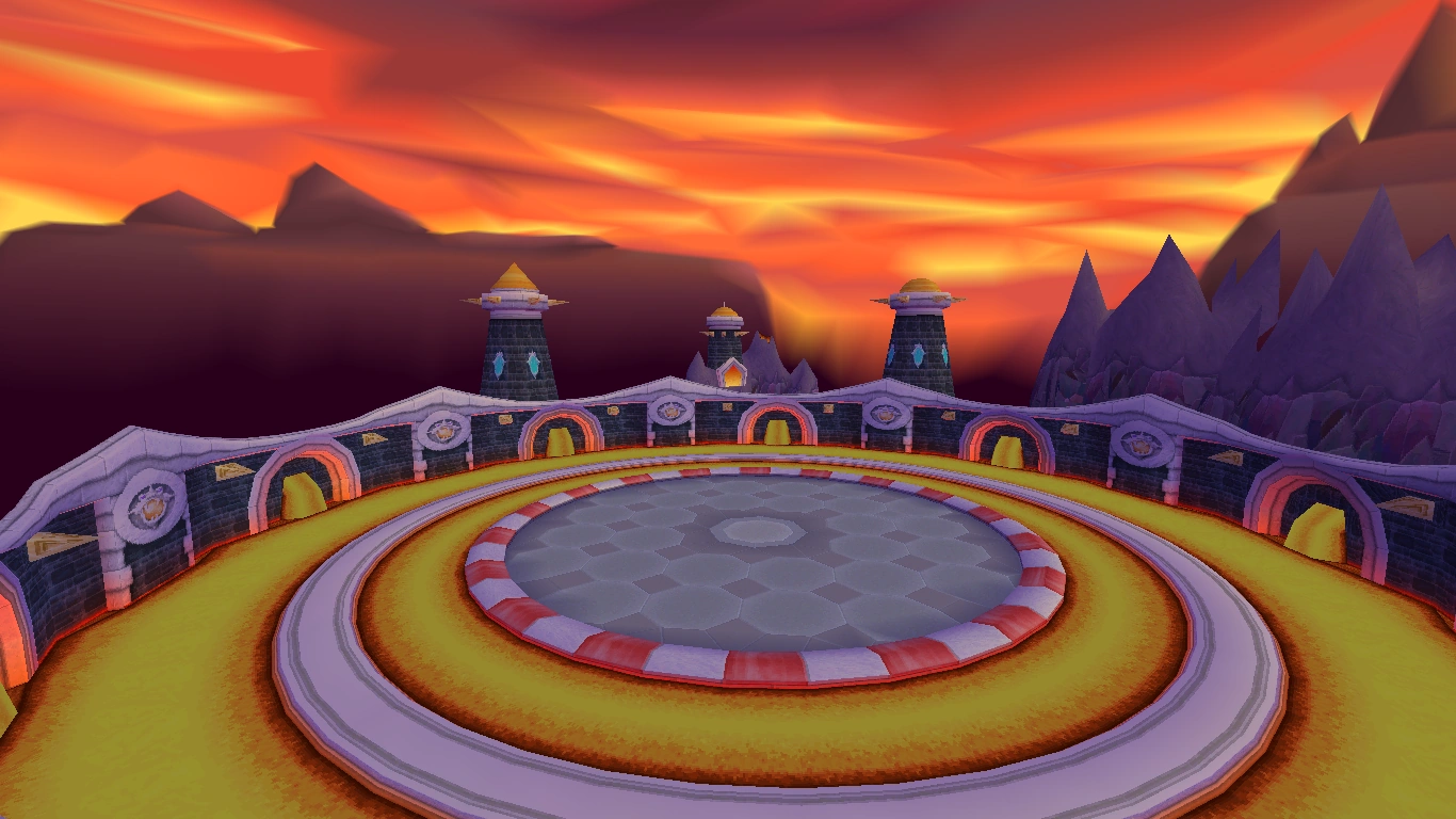 Атмосфера напоминает своеобразный ад. Небо будто бы залито пламенем, облака словно горят, само солнце, заслонённое луной, стало похоже на уголь, выгоревший до черноты. Над ареной летают шары со снарядами и овцами, которые будет сбивать для дракончика Агент 9. За стеной видны высокие и острые вершины гор и портал, ведущий в Дом полуночной горы.