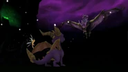 The Assassin's Shadow Wing does the attacking. It spits a smoldering bomb of green dark fire at Spyro, before ducking down below an object for protection. They don't attack Spyro directly like the previous Dreadwings and riders in A New Beginning. As seen in the third chapter of The Eternal Night promotional trailers, the Assassin is capable of fighting on his own, using the weight and spikes of his armor to do a vicious tackle.