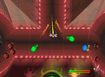 Like the previous levels, Sparx has to fight his way through the robot insects, open force fields, and confront a boss at the end that has the egg. The Robotic Ladybeetles are just like any small enemy; one shot should take care of them. The Robotic Blue Beetles act as crates, plant pots, and shells in this level, rapidly shooting Robotic Ladybeetles, except some can move, but can leave a gold gem once destroyed. The Spider Thieves have the force field keys, and Sparx will have to charge into them to get the keys. The green bugs are like the Eels from Starfish Reef, however, they move much faster and spit fire often.