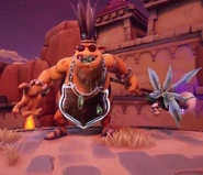 In the Spyro Reignited Trilogy, he now resembles a gnorc, and he has two teeth sticking out and pointed ears. His head feathers are sticking straight up rather than being puffed up, and his armor is connected to him with a chain and strap. His staff has a more tribal looking mask with leaves poking out behind it, and the skull on top has blue glowing sockets. He has wristbands with skulls on them, and his staff also has more skulls on it.