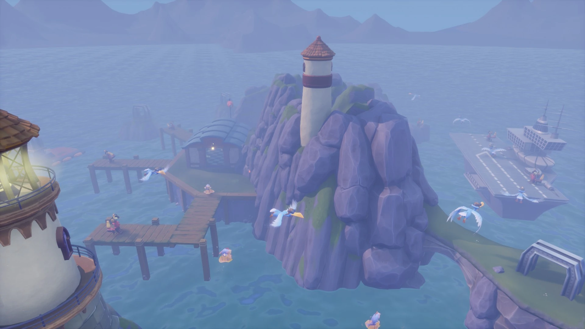 This speedway contains a series of islands in an ocean, with its main attractions being a large lighthouse that shines a light through dense fog, a ship with a runway, and a dock that has several spots for boats to dock. The local champions here are the Blue-Footed Boobies - large seagulls that fly very fast - who've never lost a race.