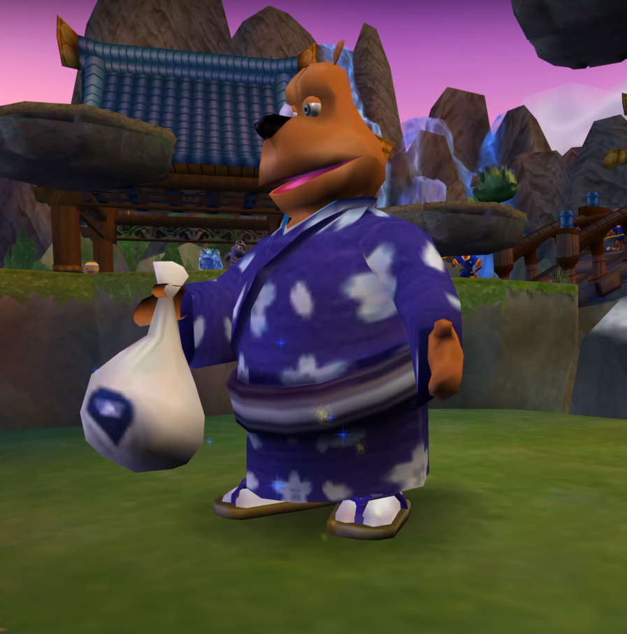 After finding that being a haiku poet wasn't as profitable, Moneybags ventured into the Fairy Realms and struck a deal with the invading Rhynocs. He was paid by Grendor to keep Spyro from accessing the Sparx Realms, but the greedy bear can be persuaded into granting the hero passage by paying the bear gems.